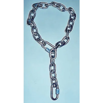 Loop over open truss, beam or pipe framework and connect forming economical hanger. 2′ of 3/8″ chain with 2 links. Order extra chain for thicker beams or longer drops.