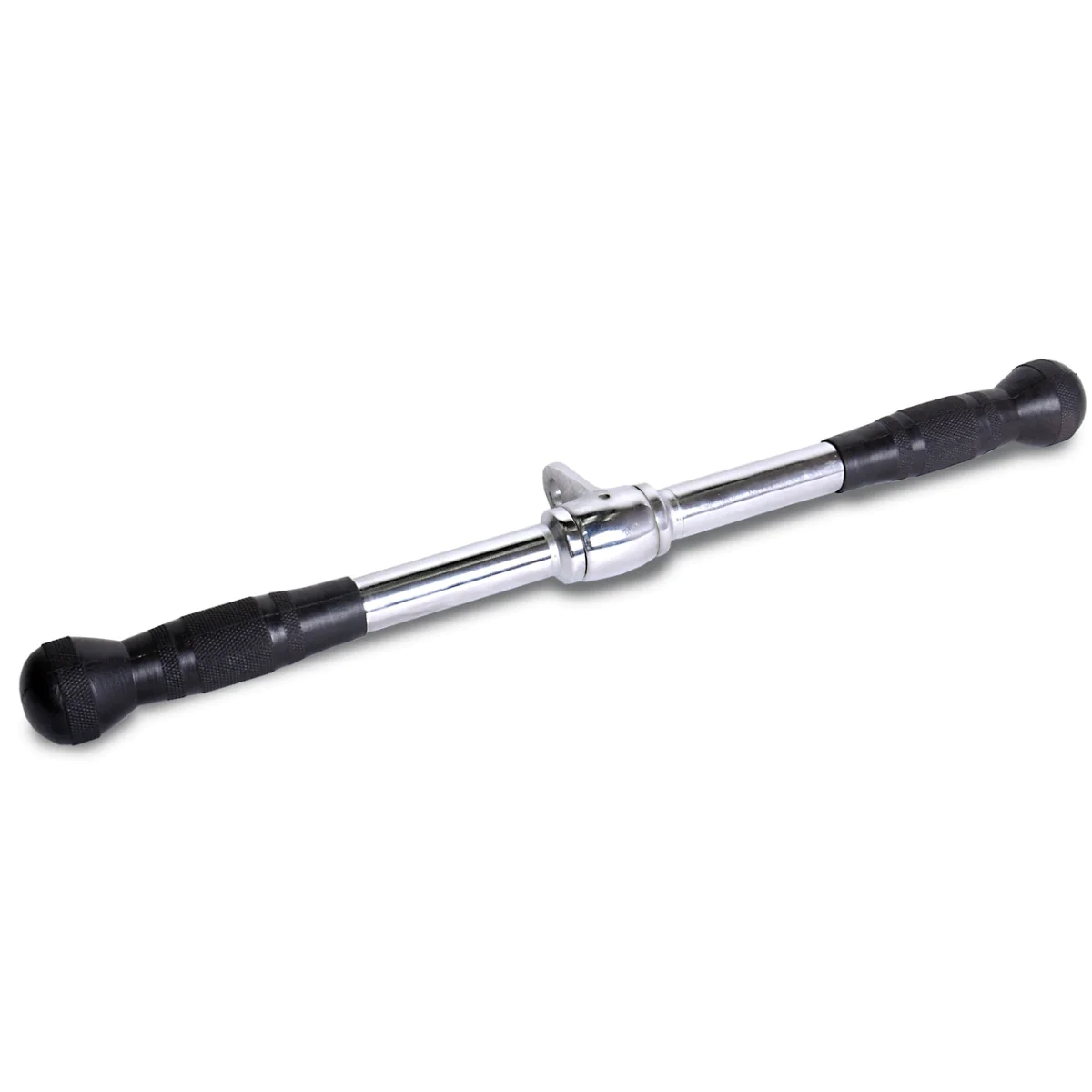 CAP Barbell Revolving Straight Bar Cable Attachment with Rubber Handgrips – The MBR-020R by CAP Barbell is a solid steel 20-inch long Deluxe Cable Attachment machine bar used for various arm exercises on selectorized strength training machines. Each end includes an ergonomically shaped rubber grip that is textured for a comfortable, non-slip grip. Rubber grips also help protect powder coat finish of surrounding gym equipment as well as floor surfaces if dropped. The revolving cable attachment point in the center of the bar reduces stress on the wrists and prevents the bar from wanting to twist
