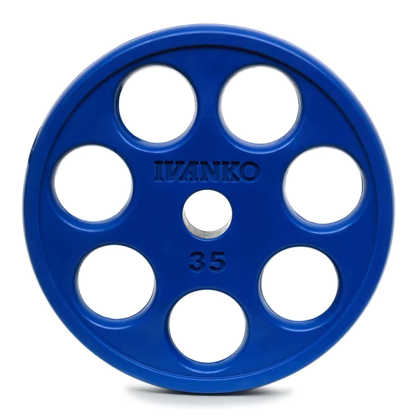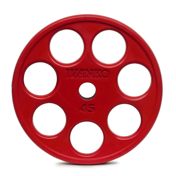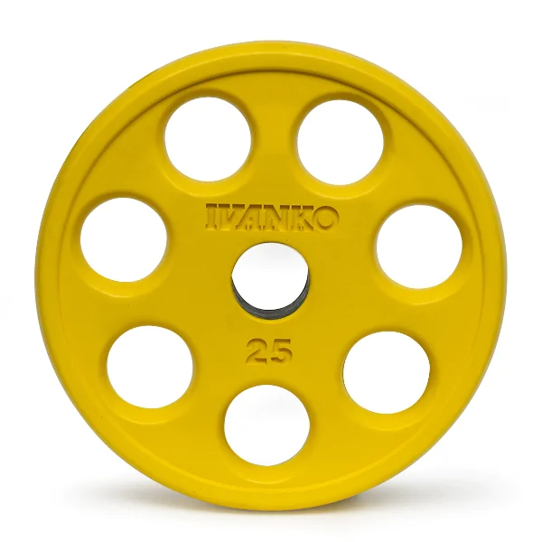 Caution – These Ivanko plates may only be compatible with an Ivanko bar. The hole size of an Ivanko Olympic plate is 50.2mm (1.976 inches) minimum to 50.8mm (2.00 inches) maximum. This diameter may be too tight for other bars. To avoid returns, if you are unsure of the compatibility of these plates with your bar please contact an IRON COMPANY® sales rep before you buy.