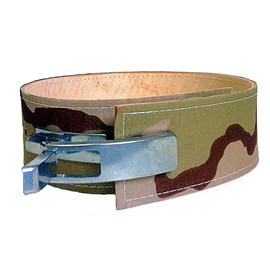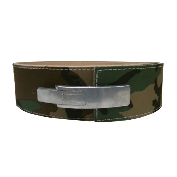 IRON COMPANY® Camouflage Leather Lever Powerlifting Belts – The IRON COMPANY Camo Leather Lever Power Lifting Belt is an American Made lifting belt with lever action closure in either 6.5mm or 13mm thickness that is covered with a layer of high quality nylon fabric with military camouflage pattern on either the outside only or both sides to add style and pay tribute to our American Armed Forces. Lever belts are great for everyone that is serious about competitive powerlifting, Olympic weightlifting, and all around weight training. Tired of pulling as tight as you can on a standard belt tongue before each round of heavy squats or deadlifts so that you can get your single or double prong to engage? And more importantly, at the end of a maximum energy set have you ever felt so winded that it was difficult to get out of your belt? With a lever belt, you can customize the fit so that you have a perfect and identical amount of protective compression around the midsection and lower back each and every time you put it on. No more fumbling with prongs and buckles at the beginning or end of an exercise set – using a lever belt during heavy-duty weight training is as quick and easy as pushing down on the lever for fastening or lifting up on the lever latch handle for unfastening. Strap yourselves in warriors!