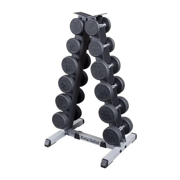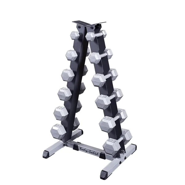 Body-Solid GDR44 Vertical Dumbbell Rack (GDR44) – The uniquely designed two-sided Vertical Dumbbell Rack from Body-Solid holds 6 pairs of cast iron hex dumbbells, rubber hex dumbbells, and urethane hex dumbbells. Each level is off-set, allowing unrestricted access to dumbbells. Place it against a wall or center it in a room. Heavy-gauge steel construction offers maximum durability and better performance in less space. For hex dumbbells up to 35 lbs. only.