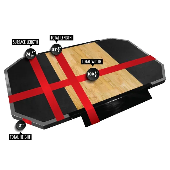 to military installations. At first glance its easy to understand how the Legend 3194 became one of the most widely used Olympic lifting platforms in the industry. Its octagonal shaped 6 x 8 footprint begins with the solid oak tongue-and-groove footing area that is designed to offer the lifter a generous work space that is stable and hard wearing. Protecting the oaks surface from friction and climate is a thick layer of polyurethane which also brings out the beautiful wood grain. Many schools and professional teams opt to have their logos printed right on the wood footing area for a nominal upcharge.