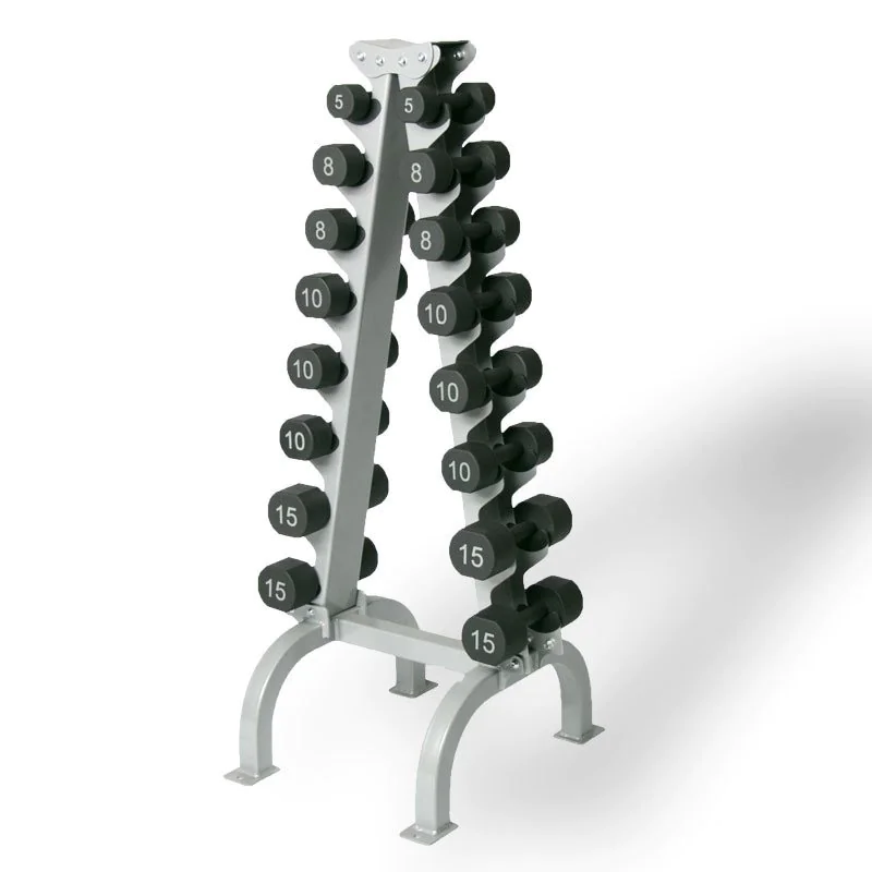 American Barbell Beauty Bell Rack with 8-Pair Urethane Dumbbell Set – Beauty Bell Dumbbells by American Barbell feature cutting-edge design and technology for the most demanding training environments. Odor-free, impact resistant urethane encases each solid dumbbell providing a sure grip and durable coating which will not crack, peel, tear or rip. Dumbbells feature a compact design and have opposing flat sides on each dumbbell head so that dumbbells will not roll around and will sit firmly in placed when utilized for floor exercises (such as push ups) while engaged in body pump aerobic strength training. Keep your dumbbells organized and off the floor with the convenient vertical dumbbell storage rack that is also elevated for easier and safer access to any dumbbell size. This functional and attractive weight set is perfect for any home gym, personal training studio, hotel workout center, or physical therapy office. The American Barbell Beauty Bell Dumbbells and Rack were originally designed and distributed by GP Industries, and continue to be produced today under the American Barbell brand name with the same industry-respected engineering and commercial quality.