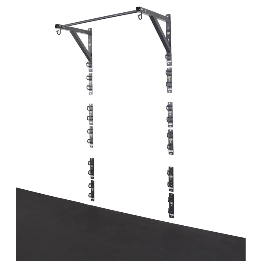 The Hammer Head Anchor Gym 4 FOOT WALL STATION is an 11-component modular system that can be configured for multiple users to create a complete functional training system. With the Anchor Gym patented hooks, it offers hundreds of exercise options and plenty of wall clearance on the Anchor Gym Pull Up Bar at top for suspension training, wide grip pull-ups, and close grip chin-ups.