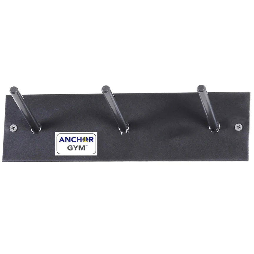 Each wall-mounted rack contains three 3.5-inch prongs designed to hold resistance bands, resistance tubing, large loop bands, stretch straps, suspension straps and any other exercise tool you may have. The three prongs will separate items as you wish and keep them off the floor. Made of 100% steel components. Mounting hardware included.