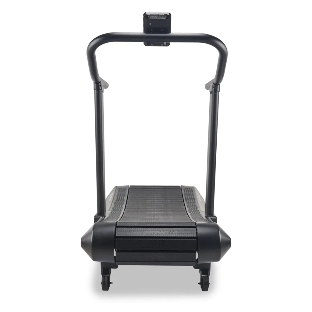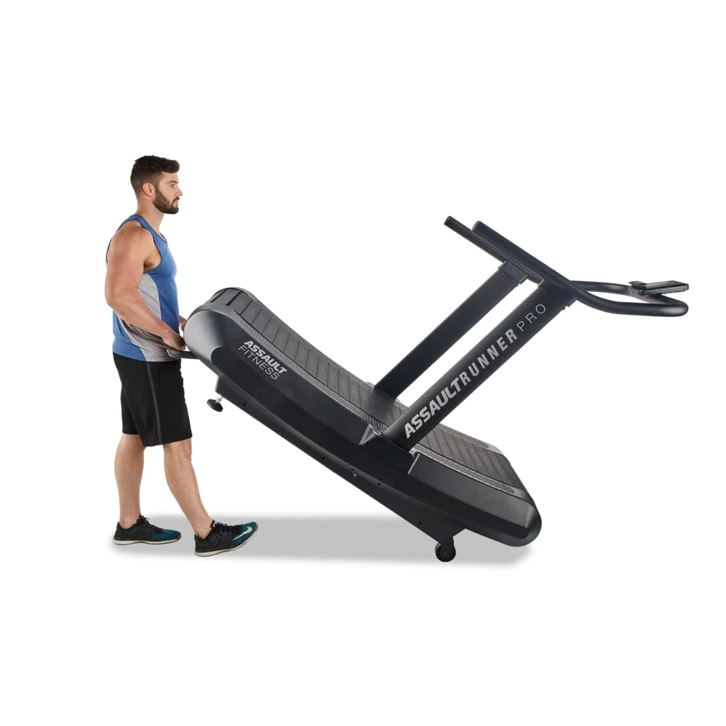 Assault Fitness AssaultRunner PRO Manual Treadmill – From the makers of the Assault AirBike, the AssaultRunner PRO manual treadmill from Assault Fitness is a motor-free, indoor running machine designed for elite fitness training and High Intensity Interval Training (HIIT). Previously known as the Assault AirRunner, the Assault Runner PRO completely redefines the manual treadmill, offering superior steel construction, dependable stability, and no-limits functionality in a streamlined, energy-efficient design. Few high-performance running machines are as lightweight (280 pounds) and portable (built-in transport wheels) as the AssaultRunner PRO, and its compact footprint makes it adaptable to just about any type of training space. A regular treadmill has a motor which is pushing your legs. With an AssaultRunner you are the motor. This motorless treadmill uses no electricity, running instead on the energy produced by the user’s own movement. Whether you’re a beginner athlete or a competitor at the highest levels, the machine can instantly conform to your desired speed, even if you change your output randomly at will. There is no maximum speed setting – if you want to push your limits during a workout, the AssaultRunner will be uniquely up to the task.