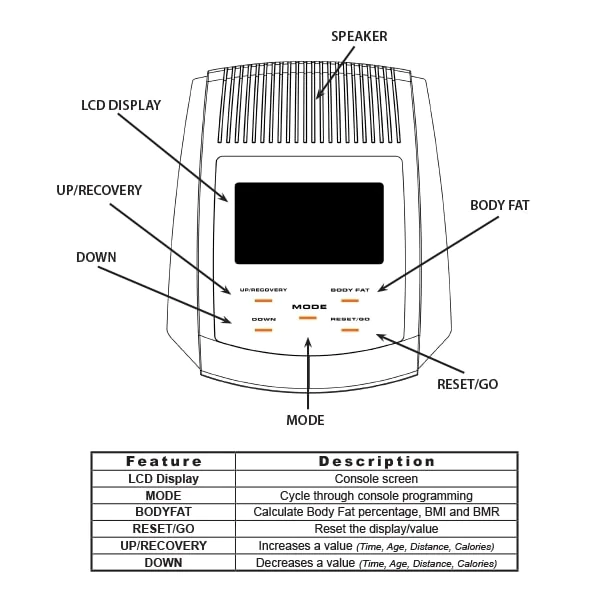The console informs the user with valuable information about the workout and allows the user to control workout resistance levels. Please become familiar with the console before your first exercise session. The display is able to be programmed to establish customized workout goals. The BFCT1 gives users the power to control their workout time, distance travelled and total calorie loss.