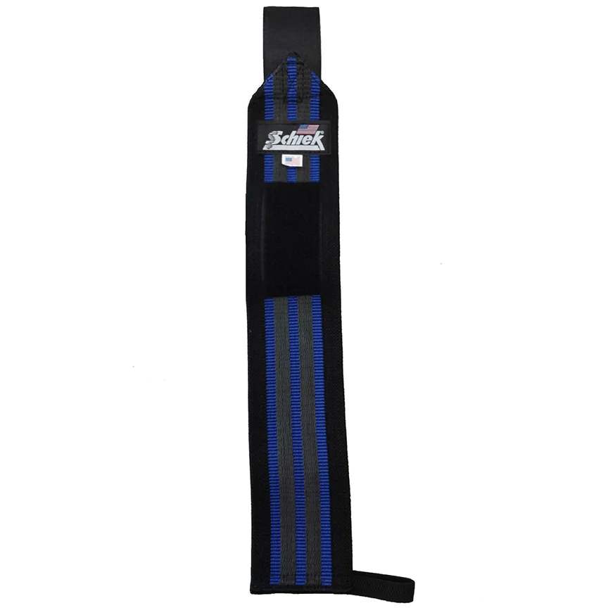 Schiek Sports Blue Line Heavy Duty Rubber Reinforced Wrist Wraps The Blue Line series of elastic wrist wraps by Schiek Sports are designed to support the wrists and help alleviate pain and prevent injury during heavy weight lifting and bodybuilding exercises. Made of materials even thicker and stronger than the best-selling Schiek White Line, Pink Line, and Black Line Series, the Blue Line wrist support wraps use 3 inch wide rubber reinforced elastic for maximum support of the wrist bones and surrounding tendons while weight training. Blue Line wraps have a thumb loop to hold the wrap in place as it is pulled firmly and securely around the wrist, and a large rectangular hook and loop fastening system to hold fast as the wrist rotates or bends during exercise. Choose from 12, 18, or 24 inch overall length depending on the size of wrist and amount of desired support. 12 inch wraps can be used by women and those with narrower wrists, or for those who still want some flexibility with the hand and palm during lifting. 18 and 24 inch wraps are intended for use with thicker wrists, and for those wanting a more stiff, inflexible gripping position where bend is not desired at the wrist (for instance with heavy dumbbell and barbell presses). The longer the wrist wrap, the more times you can wrap it around each wrist creating a stronger and thicker bind at one of the bodys smallest joints, giving you the physical and mental security to avoid unwanted wrist movement or buckling under the heaviest loads. Schiek Extra Heavy Duty Wrist Wraps are perfect for serious strength athletes, bodybuilders, and crossfitters.