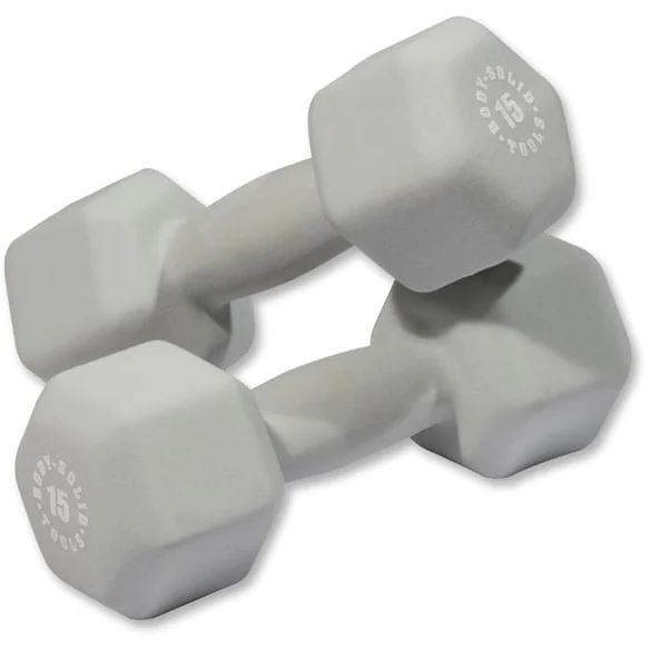 Brightly Colored Hexagonal Neoprene Dumbbell Pairs – Body Solid neoprene dumbbells are light weight dumbbells coated with a smooth and soft neoprene coating. Each neoprene dumbbell size has a unique color making each weight easy to identify from far distances. Body Solid neoprene dumbbells have a hex shaped head which prevents them from rolling and a contoured handle that is ergonomically shaped to the hand to help eliminate hand fatigue while working out. Neoprene dumbbell sets begin at only one pound each and graduate in one pound increments up to as high as 15 lbs. This low starting weight and small incremental jumps makes them ideal for physical therapy and group training classes such as Step aerobics. Use them as a stand-alone fitness tool to perform exercises such as bicep curls, squats and lunges or incorporate other equipment such as a dumbbell weight bench for performing various pressing and pulling exercises.