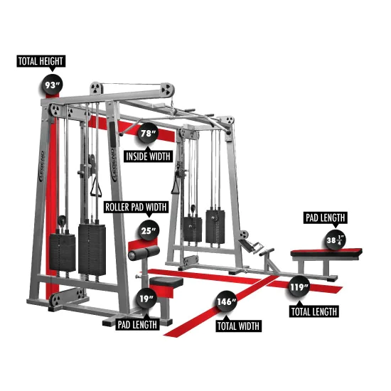 Cable Crossover Plus Stations – The 960 features a total of four weight stacks and five training stations. Station #1 is the adjustable cable crossover that includes two 150 lb. weight stacks with 2:1 pulley reduction. Easy pop-pin adjustments allow each side of the cable crossover to adjust to low, medium and high settings to hit all angles of the chest as well as providing tricep push-down, arm curl, leg adductor and abductor with an ankle cuff and many more exercise possibilities (cable crossover can be considered one or two stations). Station #2 is located immediately in back (or front) of the cable crossover station. This second crossmember includes a multi-grip pull-up station and is situated far enough away from the user of the crossover so both can simultaneously use each station. Station #2 is also a great anchor point for suspension training with products such as the CrossCore180 Rotational Bodyweight Trainer. Station #3 is a favorite for building a strong, wide back. The lat pulldown features a 200 lb. weight stack for working the lats with behind the neck pull-downs, wide front pull-downs, close grip pull-downs and many other cable attachments that can work the back from different angles. Station #4 is the low back row which is responsible for adding thickness and power throughout the lats, especially through the lower and mid sections. As with the lat pulldown, the low row will accept a multitude of cable attachments such as single and dual rowing handles.