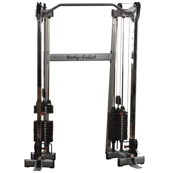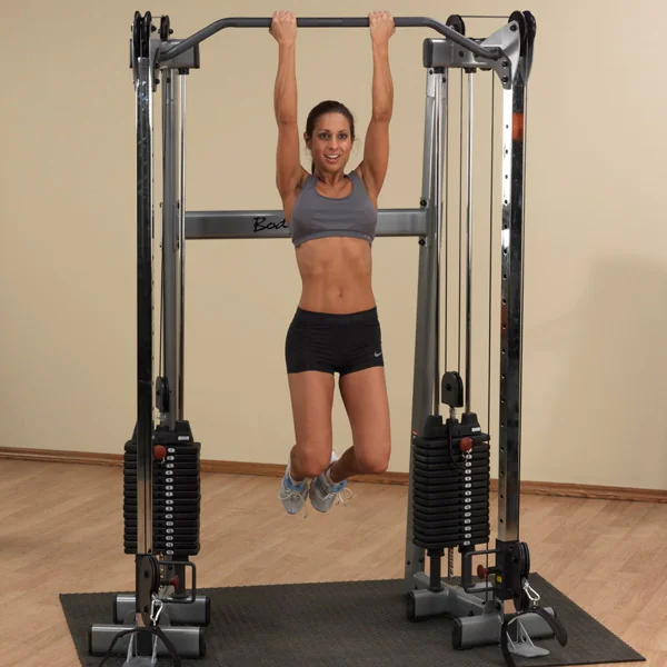 Body Solid GDCC210 Cable Machine Gym – The GDCC210 Cable Machine by Body Solid packs countless functional training exercises into a compact footprint measuring only 38 x 64. The Body Solid cable machine trainer includes two 160 lb. weight stacks that move independantly via 4.8 diameter steel aircraft cables. Each weight stack glides smoothly on polished steel guiderods. Nylon pulleys with sealed bearings rotate up to 180 degrees and include 20 lockout adjustment heights for absolute best range of motion and conform to any exercise and user height. Attach various cable attachments and use one side of the cable machine at a time for exercises such as one arm lat rows, bicep curls, tricep extensions and leg abductors and adductors. Clip on a pair of D-handles for performing cable crossovers at any height for adding strength and definition to the pectoral muscles. And when finished with resistance training on the cable machine with weight stacks, the front mounted pull-up bar is great for finishing off the back and stretching out.