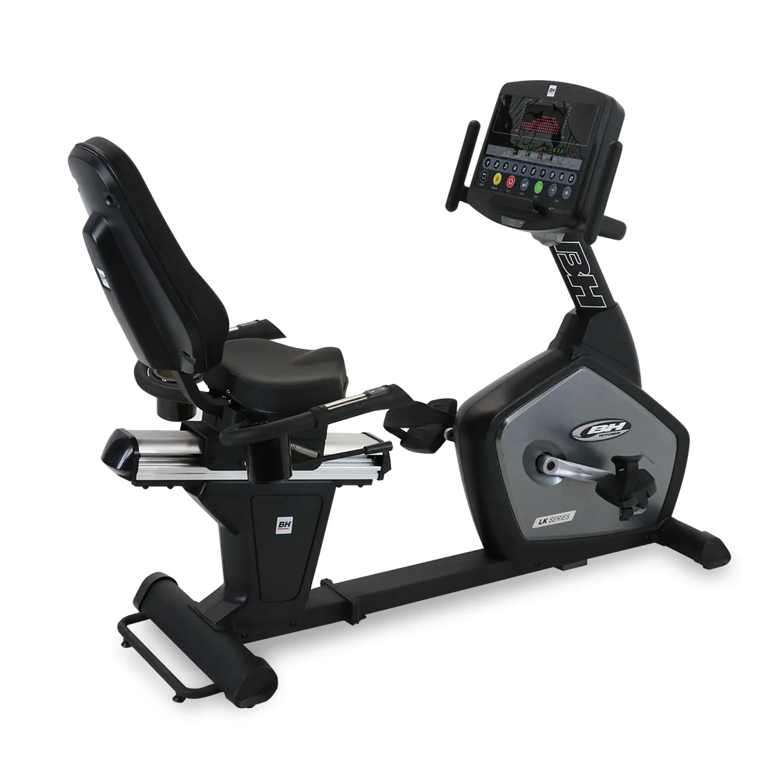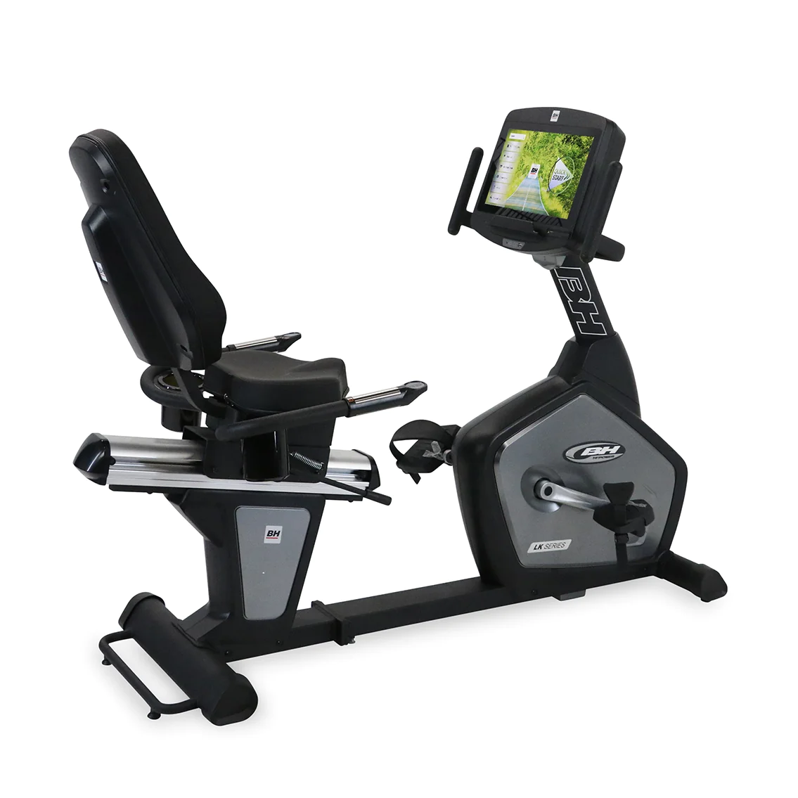 BH Fitness LK700R CORE Club Commercial Recumbent Bike – The LK700R CORE exercise bike from BH Fitness is a club quality recumbent bike with semi-reclined back support used for non-impact workouts to promote cardiovascular conditioning, weight loss, and endurance. As part of the BH Fitness flagship full commercial line, the LK 700 CORE series cardio equipment series is designed for heavy duty club use. The LK700R CORE is available with two 16″ console options: a high-resolution 16″ capacitive Touchscreen and a 16″ LED Console offering user-friendly programming in a sleek modern design. The LK700R CORE Recumbent Cycle with LED Console is self-generating, meaning it does not require external power source and is only powered up when in use. This allows gym owners more flexibility with physical placement of the machine, and also offers savings towards club fixed operating costs. The LK700R CORE has a low profile front shroud and easy walk-through design for safe entry and exit. The semi-recumbent design of the LK700R CORE puts the body in comfortable posture where the lower back is supported during exercise and legs are outstretched which lowers blood pressure and perceived exertion while riding. With a wide seat cushion the rider feels little to no pressure on the tailbone during use which also alleviates numbing and other discomfort common to upright bikes with smaller racing saddles. The lower handles near the seat feature convenient fingertip resistance controls for quick adjustments without losing focus on your workout and offer continuous access to heart rate sensor grips for pulse monitoring and target heart rate zone programming. With sleek styling, robust design and durability, superb biomechanics, and ease of use the LK 700 CORE Series Recumbent Exercise Bike will add value to your cardio training zone and help take your commercial gym, military base fitness center, hotel workout room, or home fitness studio to the next level.