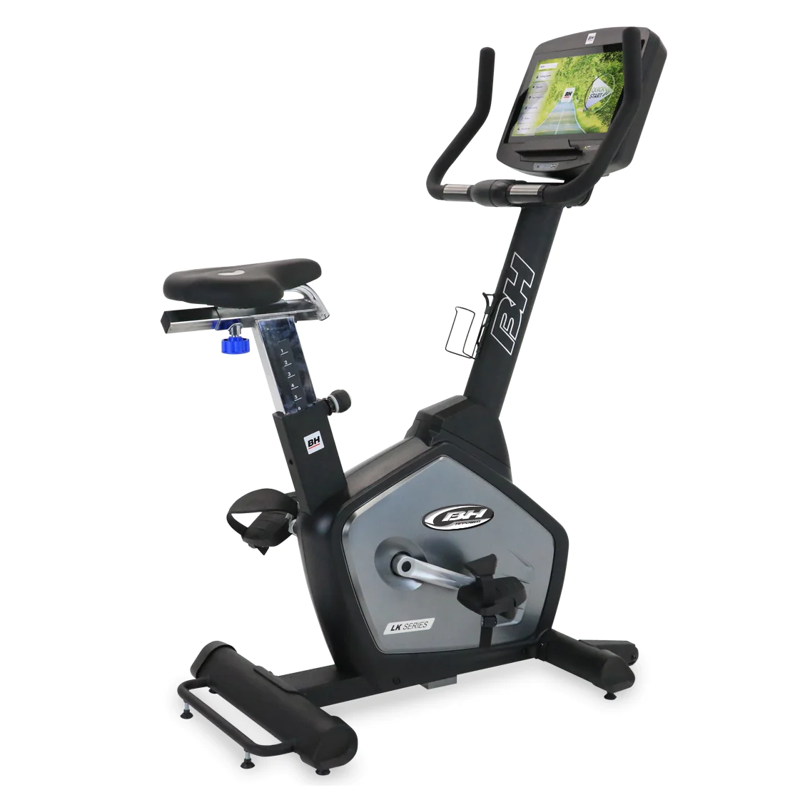 BH Fitness LK700U CORE Club Commercial UprightBike – The LK700U CORE exercise bike from BH Fitness is a club quality upright bike used for non-impact workouts to promote cardiovascular conditioning, weight loss, and endurance. As part of the BH Fitness flagship full commercial line, the LK 700 CORE series cardio equipment series is designed for heavy duty club use. The LK700U CORE is available with two 16″ console options: a high-resolution 16″ capacitive Touchscreen and a 16″ LED Console offering user-friendly programming in a sleek modern design. The LK700U CORE Upright Cycle with LED Console is self-generating, meaning it does not require external power source and is only powered up when in use. This allows gym owners more flexibility with physical placement of the machine, and also offers savings towards club fixed operating costs. The up/down and fore/aft adjustment allows for a custom fit for all users and the large cushioned seat provides the comfort required to go the extra mile. The Triathlon style handlebars with contact heart rate sensors allow for comfort and easy access to heart rate monitoring druing the workout. With sleek styling, robust design and durability, superb biomechanics, and ease of use the LK 700 CORE Series Upright Exercise Bike will add value to your cardio training zone and help take your commercial gym, military base fitness center, hotel workout room, or home fitness studio to the next level.