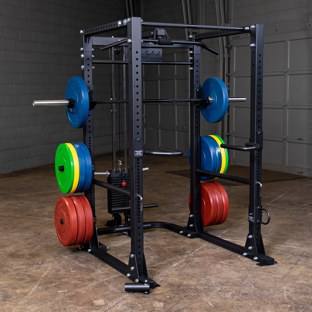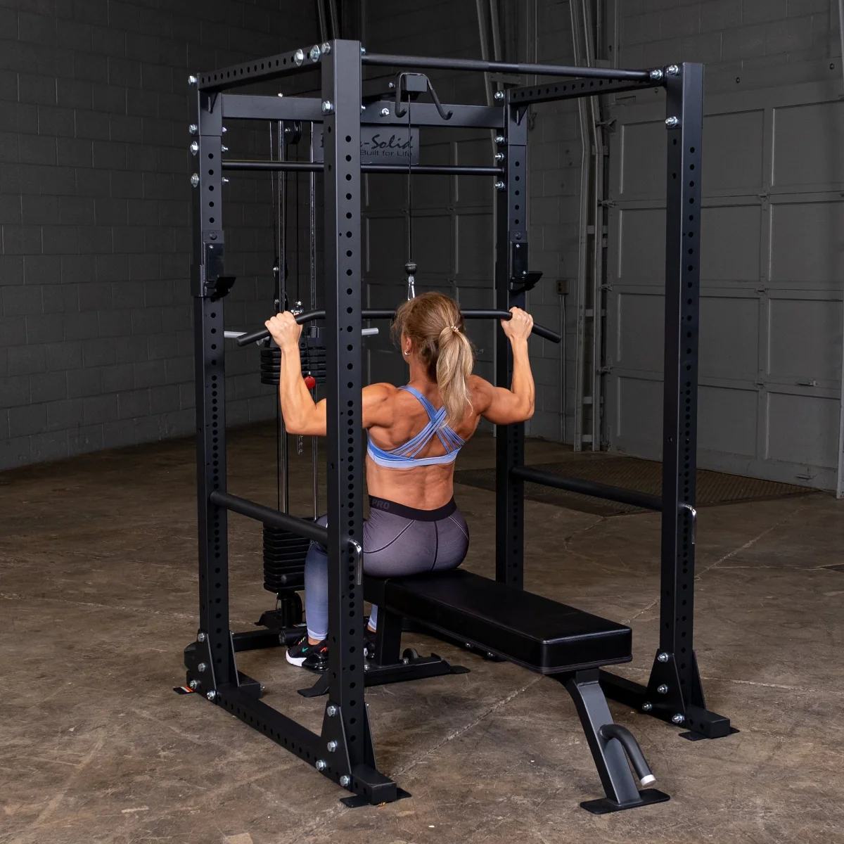 With a height of just under 80 inches with or without the optional lat attachment, the GPR400 Power Rack is shorter than most other commercial squat racks and uniquely suited to fit nicely into garages, basements, attics, and other rooms with 7-foot ceilings. The GPR400 is so sturdy that it needs no rear base frame, allowing a wide walk-in design from front or rear of the rack, and giving users increased space and comfort when using the rack for squats, lunges, rack pulls, and deadlifts. The absence of a rear base frame also means that a rolling adjustable bench press is not restricted or impeded when moved front to back for different bench press angles for chest or military press for shoulders.