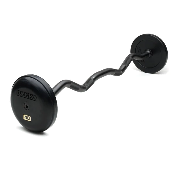 Ivanko Commercial Rubber Encased Pro-Style Barbells – The 20-110 lb. Ivanko Fixed Weight Barbell Set with Rubber Encased Plates is available in a straight bar or EZ-curl bar option. Either bar style will fit any commercial barbell rack. Use Ivanko EZ-Curl bars for arm building exercises such as bicep curls and tricep extensions. The integrated and angled narrow and wide grips allow the user to target different heads of each muscle. For a more versatile training option, consider the Ivanko