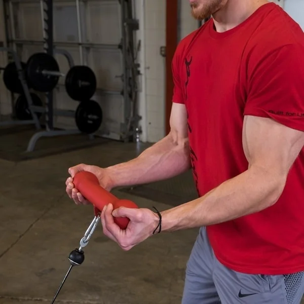 To use as a gym machine cable attachment, remove the nylon hang strap and D-ring from the carabiner. Attach the carabiner directly to the cable end of an upper pulley, lower pulley, or mid pulley. Using both hands grip the Dog Bone and use for seated cable rows, neutral grip lat pull downs, reverse grip lat pull downs, bent over rows, standing curls, seated curls, tricep pressdowns, or overhead tricep extensions.