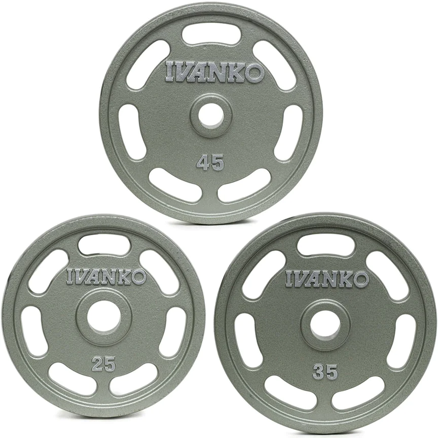 Ivanko OMEZS E-Z Lift Iron Olympic Plates w/Slotted Grips – Using the same 7-slot grip pattern as the Ivanko OUEZ urethane encased barbell plates, the OMEZS (Olympic Machined E-Z Slot)