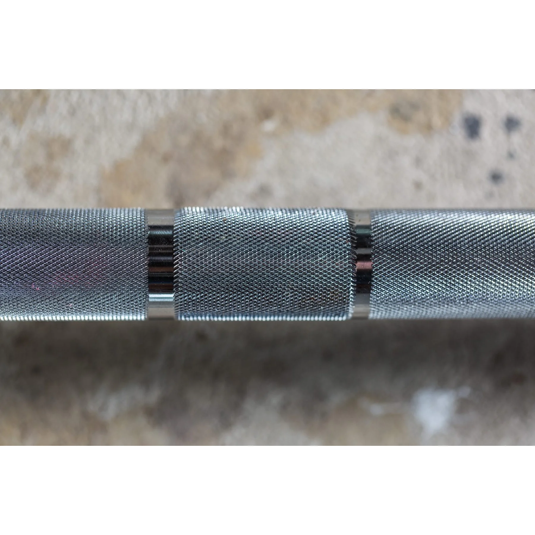 than most which makes it ideal for slower static lifts such as squats, bench pressing and deadlifts. The chromed and knurled bar shaft has a thickness of 29mm with 1.975″ milled sleeves on each end that freely rotate on high quality bearings, not bushings. The 32004 is a high quality bar at a mid-range price point and