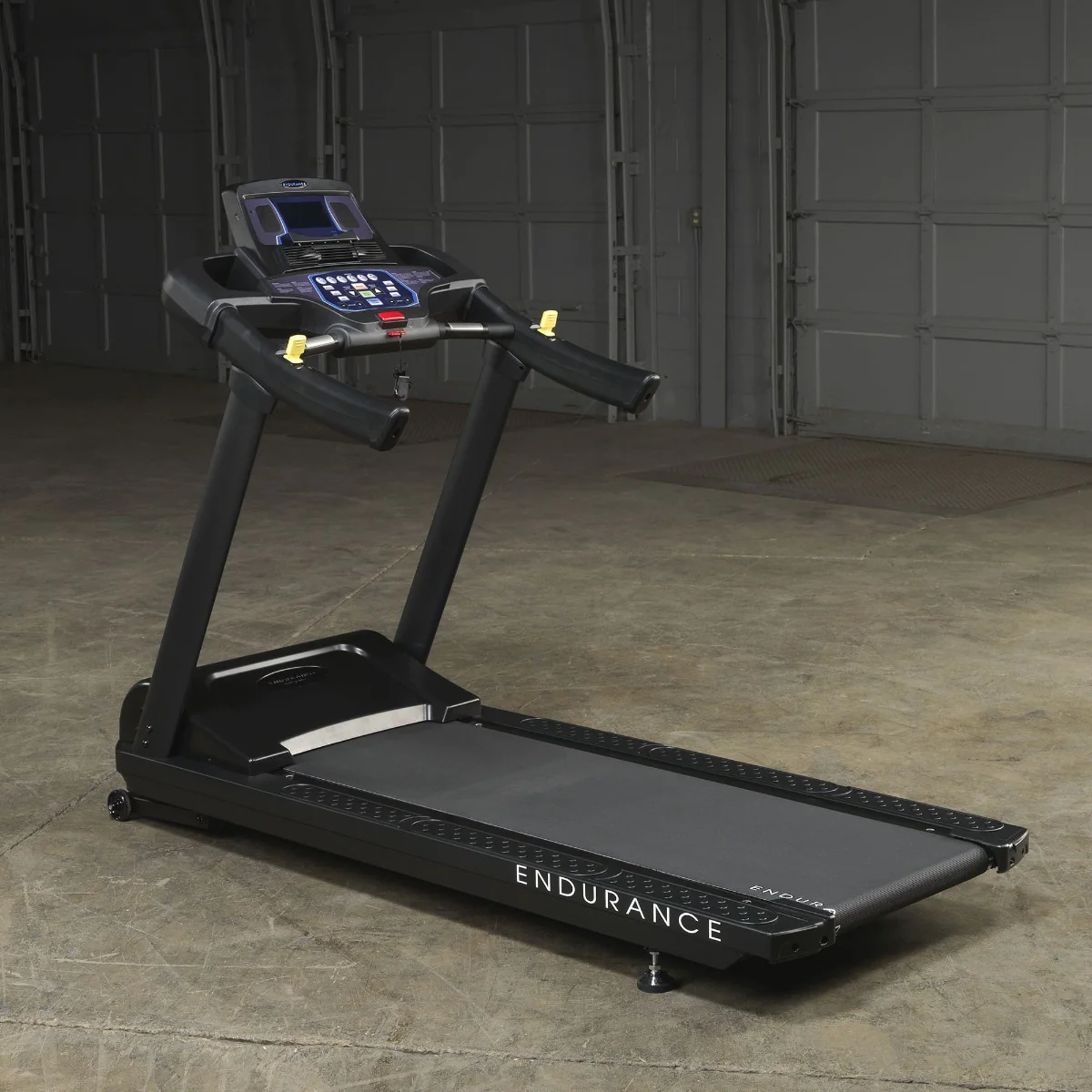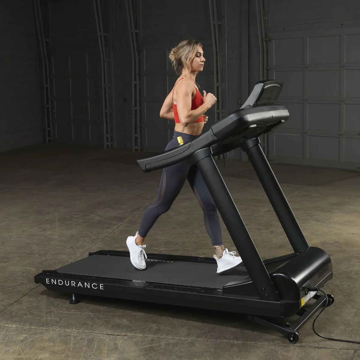 Endurance by Body-Solid T150 Commercial Treadmill – The Endurance T150 Treadmill by Body-Solid is a heavy duty treadmill rated for light commercial and home use. The T150 is a durable workhorse of a treadmill, crafted with top-of-the-line materials and precise, accurate welding which allows it withstand heavy use in light commercial facilities such as police and fire department gyms, hotel fitness centers, apartment complex gyms, rehabilitation clinics, and government facilities. The strong frame and all-steel welded construction of the T150 means it can handle exercisers up to 400 pounds walking or running for all levels of training. The standout vibration-free 4 HP motor is one of the heaviest and most powerful in its class, allowing a high-torque starting speed of 0.5 mph for slow walking up to a high running speed of 12.5 mph for performance athletes. The 22-inch wide carbon fiber woven belt over a cushioned and shock-absorbing running surface deck ensures comfortable workouts and reduces wear and tear on the exerciser’s legs and joints. The Body-Solid T150 Treadmill has high-level, state-of-the-art, and user-friendly features, functions, and technology which makes it perfect for any home gym or fitness training facility looking for a premium user-experience with quantifiable results and feedback. Whether users are walking to lose weight or stay in shape, training for a marathon, or integrating running into their high intensity interval training (HIIT), the T150 treadmill has the versatility and functionality to help them achieve their weight loss, cardiovascular, or performance goals.