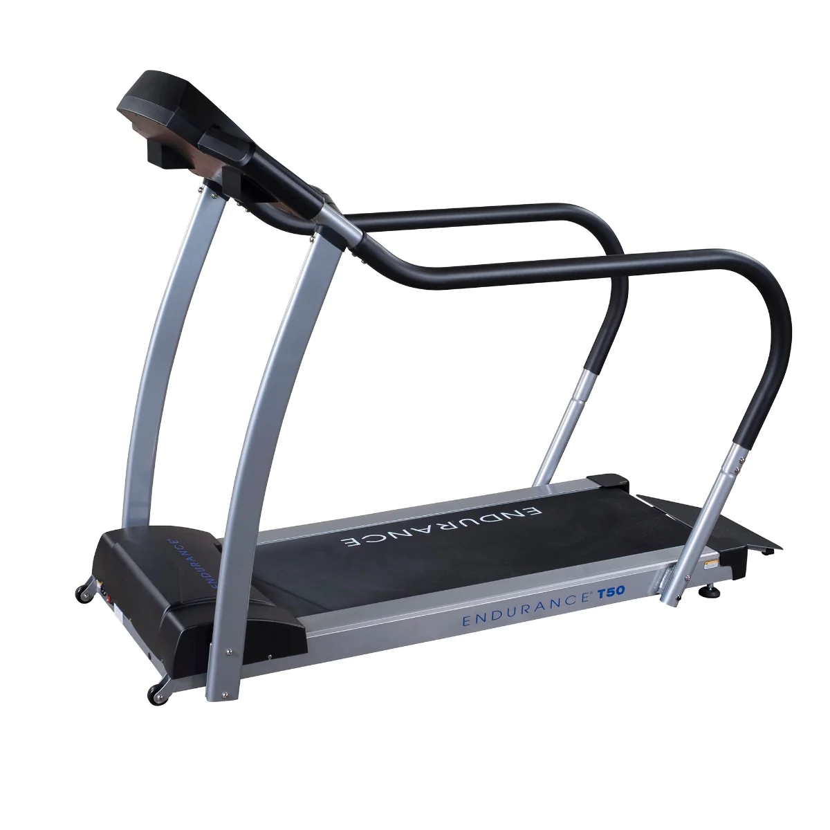 Body-Solid T50 Endurance Walking / Rehabilitation Treadmill – The Endurance T50 Walking Treadmill by Body-Solid is a simple and safe treadmill intended for rehabilitation patients, seniors, and individuals who have been sedentary for an extended period of time. The T50 has also been designed for users in need of strength and aerobic conditioning. To simplify and benefit its intended user, Body-Solid has removed unnecessary frills, needless programs, higher speeds, and even incline from the T50 treadmill. The result is a basic yet fully functional treadmill which allows safe approach, generous walking area, and the security of body stability and balance during use. While other “walking” treadmills feature 1/4 to 1/2 length hand rails, the T50 extends the handrails the FULL length of the treadmill frame which not only allows more peace of mind for those not sure on their feet but also provides a secure area to hold while entering the treadmill from the rear. Each handrail is fully padded and 2 inches in diameter providing more comfort to those with weaker hands or suffering from arthritis. Gone are confusing programing buttons and tiny keypads from the display console. Simply step on, press Start, and then adjust speed up or down. While most treadmills have a starting speed of 0.5 miles per hour (or slightly faster), the Endurance T50’s high-torque motor allows for the slowest possible starting speed of 0.1 MPH. The motor is strong enough to move up to 310 pounds of user body weight on the belt itself from a dead stop. This means that there is no need to position feet on the side rails before moving them onto a moving belt, which can be a falling hazard to those with weaker balance or stability looking downward rather than straight ahead. And with its low profile step-up height, easy-to-read large LED displays, heart rate monitoring, and wheelchair accessible ramp, the T50 is crucial for cardiopulmonary, respiratory, orthopedic, sports medicine, athletic training, bariatric and older adult patients.