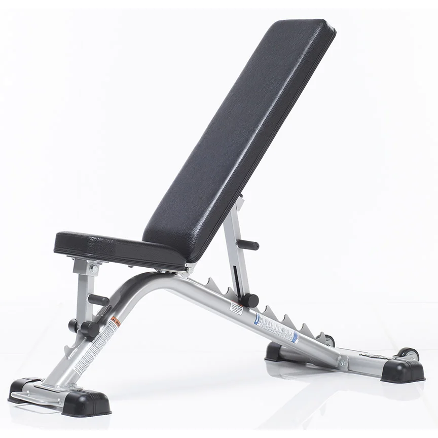 TuffStuff Fitness Evolution Series Flat Incline Ladder Bench Are you looking for a light commercial flat incline weight bench for upper body dumbbell exercises? With seven easy gun-rack style hook and ladder adjustments on the back pad, this utility bench can quickly and easily adjust without pull-pins or fuss from a horizontal flat bench press position, through several incline bench press settings, to a full upright position for military press exercises. Use by itself, or grab the built-in handle on the front base and roll the workout bench inside a power cage, half rack, or smith machine for performing barbell workouts.