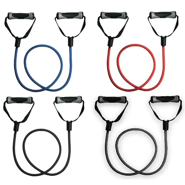 Grizzly Fitness Resistance Cables – Resistance Cables from Grizzly Fitness are made from high quality surgical grade resistance tubing with strong, versatile handles on each end for comfort and a sure grip allowing full range of motion during exercise. Grizzly Elastic Cables come in four different cable tensions for various workout intensities. Medium resistance tubes are great for rehabilitation and toning targeted muscle groups. Heavy, super heavy, and intense resistance level fitness tubing is intended for strengthening and building muscle. Comfort grip handles with concave design keep hands centered and in proper position from any angle during exercise movement. Fitness cables are color coded by resistance strength level for easy identification during youth fitness, senior fitness, or cardio strength group classes. Lightweight and portable Grizzly Resistance Cables are also perfect for personal use at home or while traveling.