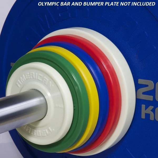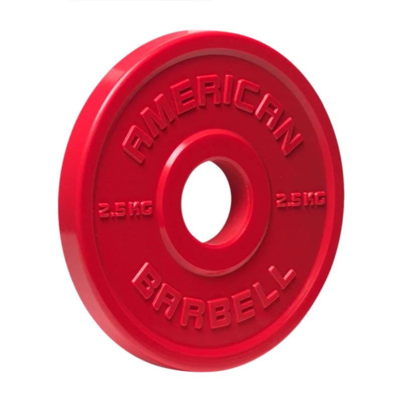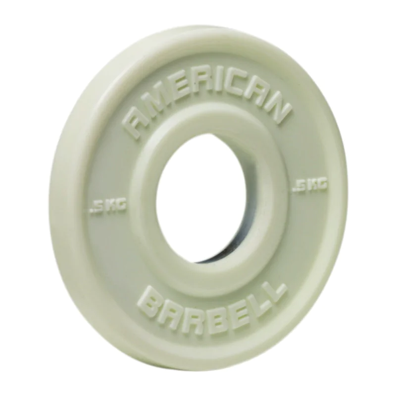 American Barbell Urethane Fractional Olympic Weight Plates in Pounds or Kilograms – Fractional Plates from American Barbell are urethane coated Olympic plates designed for smaller incremental weight jumps during Olympic weightlifting, powerlifting, and technique training. Bumper plates in most gyms are not found smaller than 10 pounds in weight. American Barbell Fractional Plates in Pounds allow you to increase lifts by as little as one half pound, one pound, one and a half pounds, or two pounds. Stack multiple fractional plates on each end to create custom combinations of incremental weight jumps to meet your specific training progression needs. While bumper plates in kilograms can be found as light as 5 kilograms in full 17-3/4 inch to 18 inch sizing, those thinner plates are much less durable than their thicker and heavier counterparts even when placed side-by-side during use, and often experience warping and breakage from repeated slams to floor over time. American Urethane Kilo Fractional Plates range in diameter from 5-1/4″ for 0.5 kilogram size to 9″ for 5 kilogram size, meaning they will never come in contact with the ground during deadlifts, clean and jerks, snatches, and other high impact weightlifting and powerlifting movements. Fraction plates, also known as change plates and record breakers, are a valuable micro-loading tool for progressive strength training to overcome plateaus, learn technique, reach the next level in strength gains, and increase your personal best.
