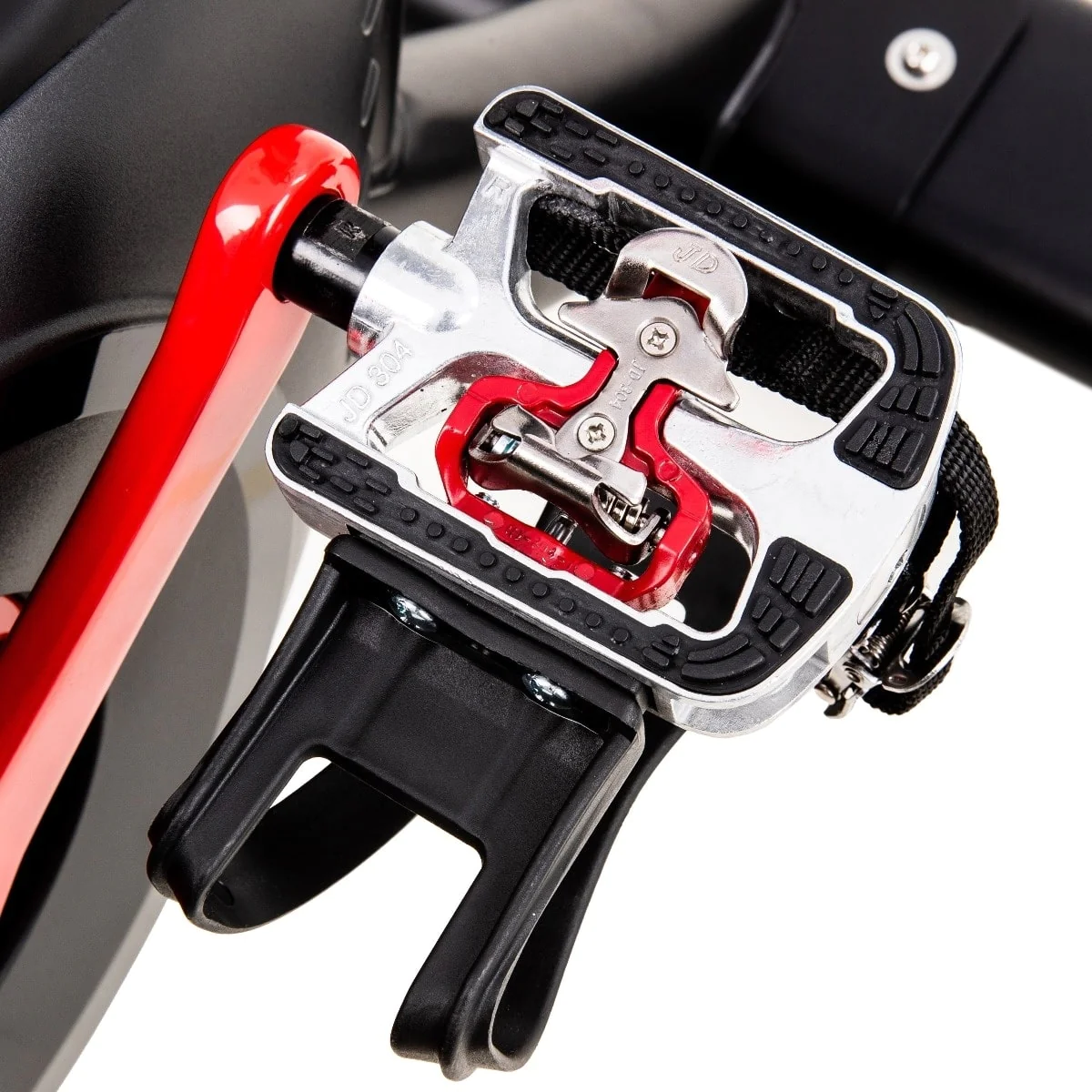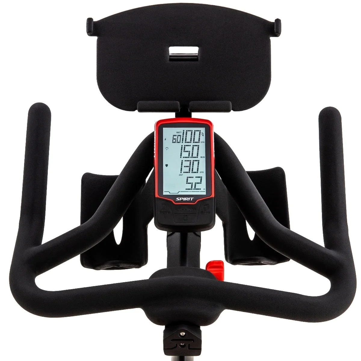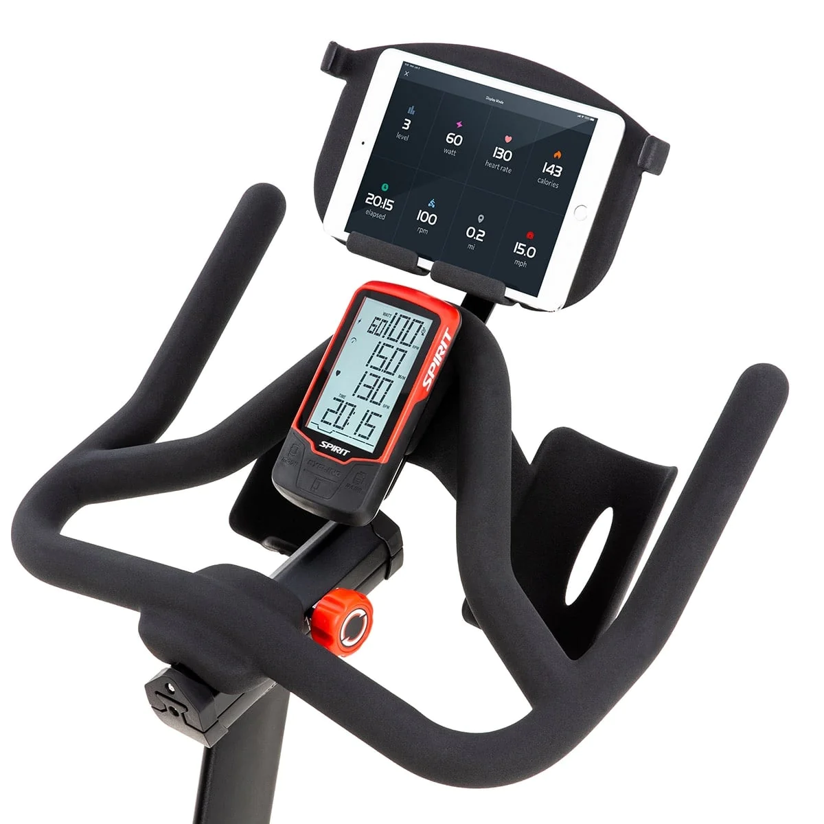 Spirit Fitness CIC850 Commercial Indoor Cycle – The CIC850 Indoor Cycle from Spirit Fitness is a high performance indoor cycle designed for use in health clubs, YMCA facilities, community centers, cycling studios, personal training centers, and home gyms. User experience is enhanced by smooth magnetic resistance and poly-v belt drive, 4-way seat and handlebar adjustability, and pedals featuring both SPD and toe cage design. The combination of a large LCD Bluetooth console and adjustable tablet holder allows users to use their phone or tablet to help train with 3rd party apps for increased motivation and competitive drive. Does your virtual cycling instruction platform call for dumbbell interval training? Small dumbbells can be stored right under your seat for easy access during workouts so you don’t have to exit the bike and interrupt your training session. The heavy fly wheel is positioned behind the rider, keeping it free from sweat during intense sprints. Dual water bottle holders keep hydration within reach, so saddle up and get cranking towards achieving your fitness goals!