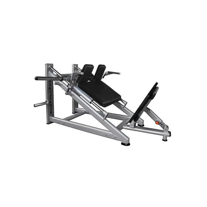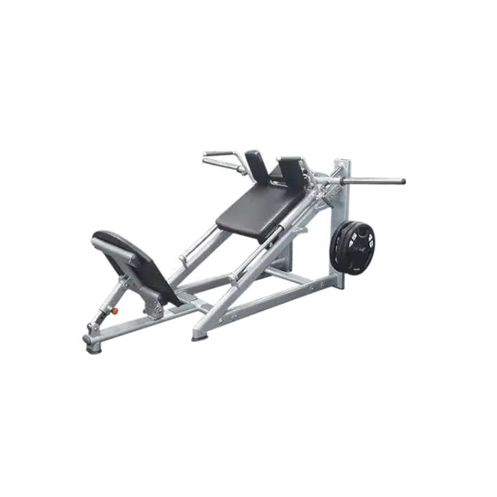 30 Degree Linear Hack Squat Machine – Muscle D Fitness (MD-HSM) – The Muscle D 30 degree hack squat machine with linear bearings is designed to provide leg workouts specifically targeting the quads, hips, glutes and hamstrings. Unlike a 45 degree hack squat, the Muscle D 30 degree hack provides the user with a lighter starting weight and helps reduce stress on the spinal column. The carriage includes thick, closed-cell foam pads for the shoulders and back all of which rides on a super smooth linear bearing system. The wide, non-skid rubber foot platform is adjustable and allows the user to adjust the foot position to isolate different muscles in the legs or increase resistance on the glutes. Weight plate storage is included and is attached to the overbuilt tubular steel frame.