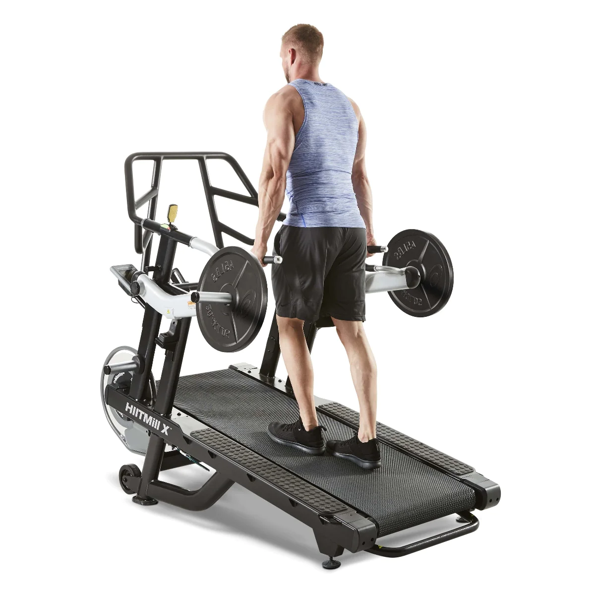 The HIITMill X features a 3mm custom cushioned PVC belt that provides added grip for heavy pushing and carrying activities. This unique cushioned belt adds more friction to the system and will limit lighter users under 110 pounds from freely walking and running without pushing off the forward handles. The advantage of the HIITMill X is significantly more traction for heavy pushing and heavy lifting activities. The HIITMill X also features the Farmers Carry lift arms allowing for the addition of up to 90 lbs of weight plates to be added on each side. The arms themselves weigh 10 lbs so the total available max carry weight per side for bilateral or unilateral carries is 100 lbs.