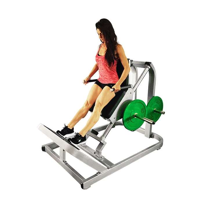 Incline Calf Raise – Muscle D Fitness (MDP-2003) – The Muscle D Incline Calf Raise Machine is like a mini hack squat for the calves. This plate loaded calf machine consists of a carriage, guide rods and foot platform. Unlike a standing calf raise, the Muscle D MDP-2003 is designed with a seat, low back pad and handles allowing the user to perform calf raises with no direct resistance loading the spine. This is a good calf exercise option for those with back issues that want to train their calves with more than just a seated calf machine. Oversized polyurethane wheels and chrome guide rods provide smooth travel even when fully loaded. Trainee’s will experience a full calf stretch at the bottom of each rep thanks to the integrated foot plate design. And chrome weight horns in the back keep enough weight plates on hand to fully load the machine.
