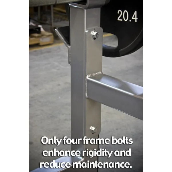 for plates between sets. Each bolt-on weight storage solution provides weight pegs on the inside and out and holds all plate sizes from 2.5 lbs. to 100 lbs.. Even with all that storage, the 3154 still allows plenty of room for a spotter on the spotting platform