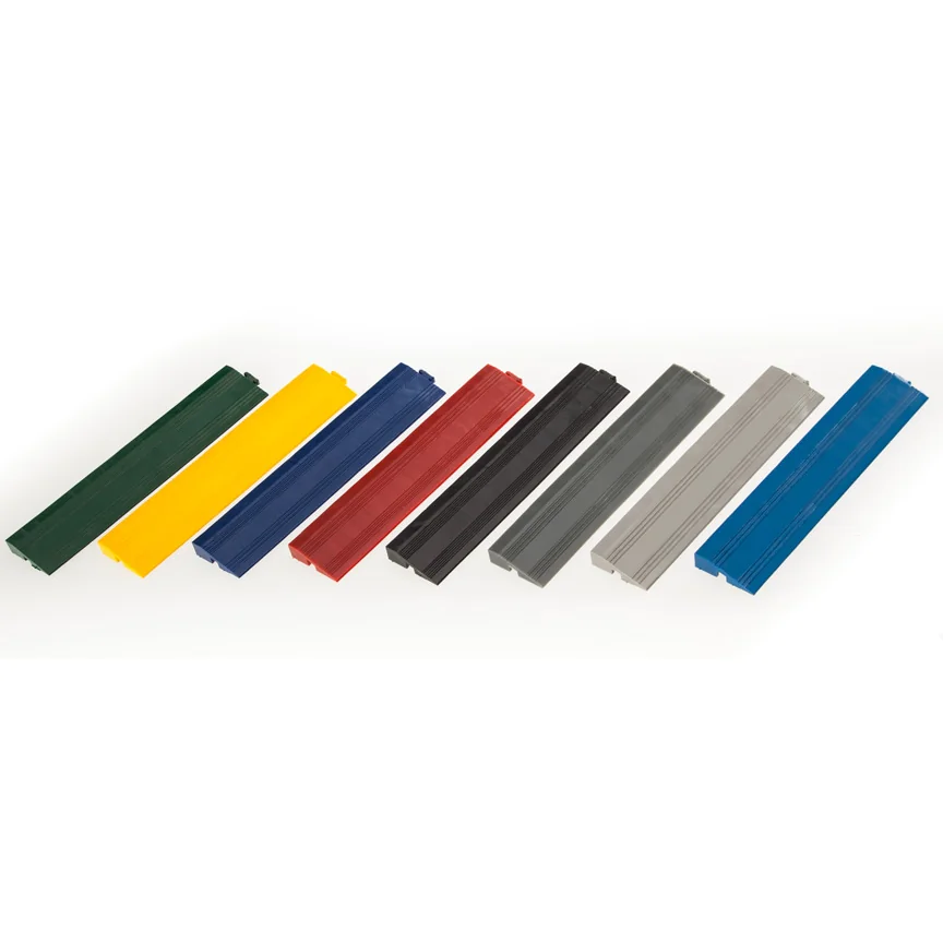 Interlocking Beveled Reducer Strips For Modular Interlocking Plastic PVC Tiles – Create a clean, functional transition edge for shower facilities and aerobics room flooring areas. Each interlocking PVC reducer strip snaps in to PVC Shower Tile and Aerobic Tile modular flooring creating an esthetically pleasing transitional ramp that eliminates trip hazards. Each flooring transition strip is molded to fit perfectly alongside center tiles and corner pieces including perfectly matched color choices.