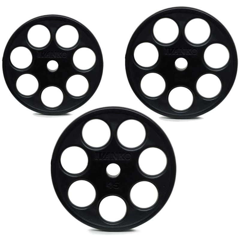 Ivanko ROEZH Olympic Rubber Coated E-Z Lift Plates – After their phenomenal test run in select health clubs in the UK, Ivanko brought their yellow, blue and red rubber coated ROEZH Olympic plates to clubs here in the US. These colored barbell plates brought fresh color to an already beautiful grip plate and in the process allowed club owners to brighten up their weight rooms breathing new energy into facilities everywhere. Whether it is the gray iron, black or colored rubber ROEZH “revolver plates”, Ivanko is thought to have the most aesthetically pleasing grip plate design on the market. Combine that with the most stringent manufacturing and quality control guidelines in the fitness industry and you’ve got a product that not only looks great but will provide years and years of trouble free use in a commercial environment.