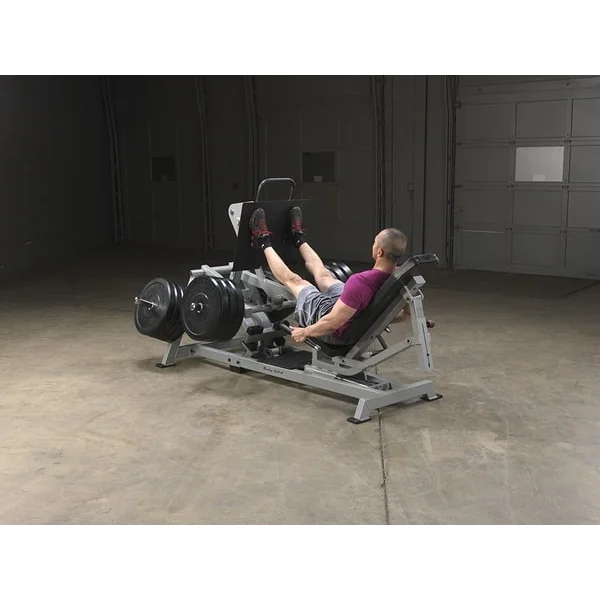 Body-Solid LVLP Pro ClubLine Leverage Leg Press – The LVLP Leverage Leg Press by Body-Solid is a commercial rated strength machine which uses plate loaded resistance and leverage movement to isolate and strengthen the quadriceps, hips, glute, and calf muscles of the lower body when performing the leg press exercise or calf extension exercise. The Body-Solid LVLP provides the natural feel and resistance of free-weights with the control of a machine. The direct drive press system provides effective weight resistance. The diamond-plate pivoting footplate helps the exercise maintain correct form and position throughout the range of motion when performing leg press for upper legs or calf extensions for lower legs. Load up this machine with Olympic weight plates or Olympic bumper plates for resistance, and store them on the convenient weight storage post at the back of the machine when not in use. The LVLP Leverage Leg Press is perfect for any commercial gym, hotel workout room, personal training studio, or garage gym at home.