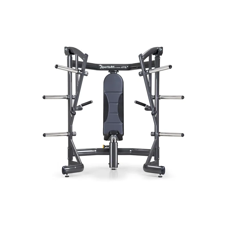 SportsArt A978 Plate Loaded Series Wide Chest Press – The A978 Wide Chest Press from SportsArt Fitness is a commercial plate loaded strength machine for lower and outer chest training featuring press arms with independent movement and converging pushing angles to increase the range of motion of the seated wide bench press exercise. The wider grip bench press focusses especially on the outer chest muscles, thus engaging the pectoralis major muscle group more intensely as compared to a narrower grip (which produces greater activity in the triceps). Progressive strength curve gradually increases force at end of movement when user is in strongest position, allowing user to engage more muscles. The A978 has a 500 pound maximum weight load rating for heavy duty training. Oversized handles make pressing exercises more comfortable by spreading the load over a larger area of the users hand and the easy seat adjustment means a broad range of user heights can be accommodated. The A978 Plate Loaded Wide Chest Press allows you to use Olympic plates with a 2″ center hole for resistance. Load your plates onto the weight horn on each press arm. Store your plates while not in use on the four weight posts attached to the frame uprights. The welded heavy-duty steel frame has stylish, sleek lines created through oval tube steel. Major frame pieces bolt together allowing easier transport prior to assembly. Electrostatic powder coating insures the finish is resistant to scratches and dings for a long term beautiful finish. Heavy-duty vinyl cushions are comfortable and durable for club use. Rubber non-skid feet cover base frame supports to avoid sliding of machine or scratching of floors. All components are commercial grade on SportsArt’s world-class health club strength products to make the A978 Wide Chest Press Machine perfect for any commercial gym, fitness center, home gym, hotel workout center, personal training studio, or corporate wellness facility. The SportsArt Plate Loaded Series combines quality and value in a simple, easy-to-use free weight strength line designed to accommodate users of any fitness or experience.