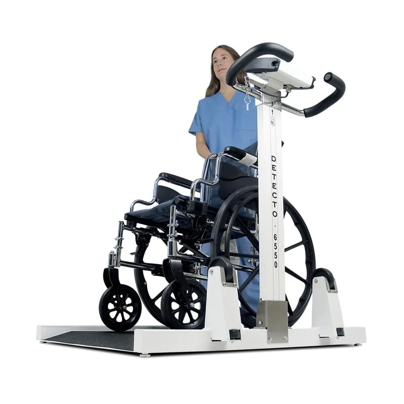 Detecto Portable Wheelchair Scale – This sturdy, but lightweight, scale offers a wide range of versatility. It can be used with wheelchairs, straight-legged chairs or as a stand-on scale, and its sloped ramps offer versatility by allowing loading from either side. The 6550’s vertical fold-up feature and heavy-duty wheels contribute to its ease of mobility and lack of needed storage space.