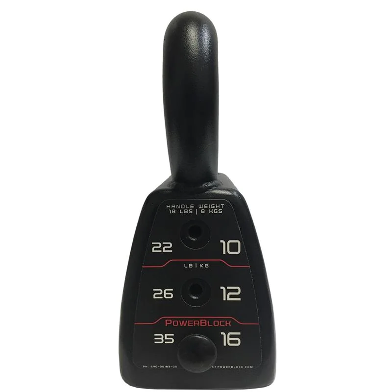 The PowerBlock Adjustable Kettlebell features a base weight of 18 pounds for the handle and shell. Underneath the shell are a stack of three weighted core blocks weighing 4, 4, and 9 pounds in sequence from top to bottom. Changing the position of the magnetized selector pin on the side of the kettlebell will engage and lock in the core blocks from the top of the stack down adding overall weight to the kettlebell for use during exercise. The unused core blocks are left behind in their original storage position on a flat surface. This allows you to create additional functional weight increments of 22, 26, and 35 pounds. As many traditional kettlebell routines call for metric increments, these four poundages equate to 8, 10, 12, and 16 kilograms, the most popular sizes requested when sourcing individual kilogram kettlebells. Any exercise you can do with a traditional kettlebell you can do with this space saving, quick change selectorized kettlebell!