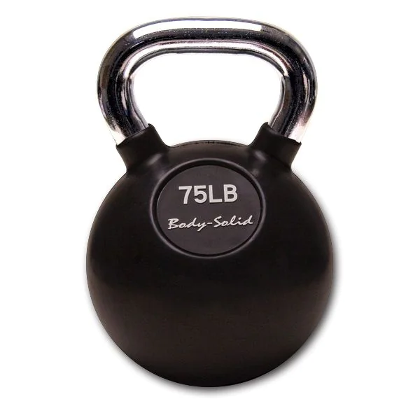 Body-Solid KBC Premium Kettlebells with Chrome Handles – KBC Rubber coated kettlebells with chrome handles by Body Solid are encased in thick virgin rubber to be impact resistant on floors and surrounding equipment as well as protect the kettlebell body itself from scratches and rust. Body Solid rubber kettlebell sets are many times more durable than neoprene or vinyl coated kettlebells and are ideal for commercial environments such as gyms and Crossfit boxes. The virgin rubber is impervious to moisture and resists cracking and drying out over time. Another unique feature of the Body Solid rubber kettlebell is the smooth chrome kettlebell handle. Unlike iron kettlebells which may have burrs, rough areas, or other imperfections from casting on the handles, Body-Solid KBC Kettlebells have smooth, chrome plated handles which allow comfortable grip and easy rotation for swings. The chrome plating is near impossible to chip, meaning your kettlebells will look and feel new for years to come.