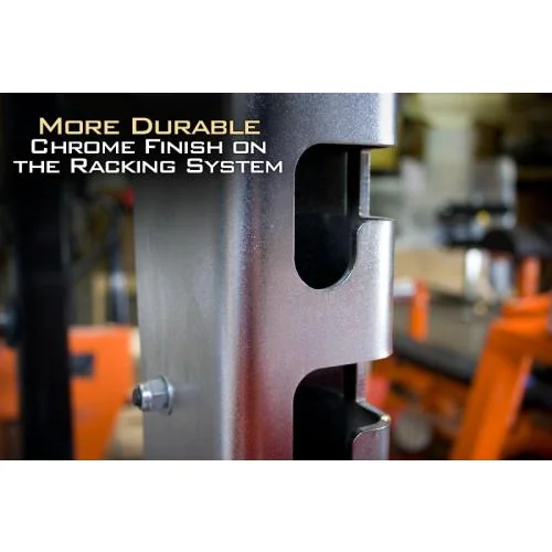 12 chrome-plated, frame-welded, numbered, Olympic-size plate storage pegs that are slightly angled for safety.