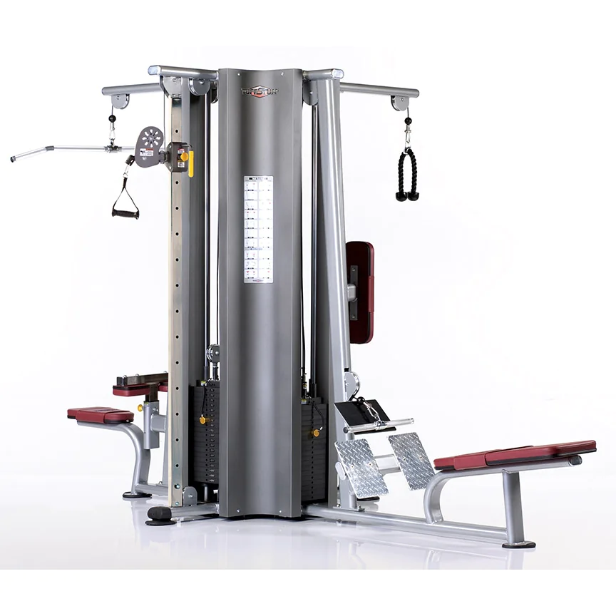 Proformance Plus PPMS-4000 Jungle Gym – The Proformance Plus 4-Station Selectorized Jungle Gym by TuffStuff Fitness is a customizable modular resistance training system that really packs a punch in terms of the exercise variety you can offer in a minimal footprint capable of accommodating up to four users simultaneously. Though you can customize the system to meet your needs, the shown configuration that includes a lat pulldown, low row, triceps pressdown, and adjustable high/low pulley is a popular and effective one for hitting several major muscle groups.