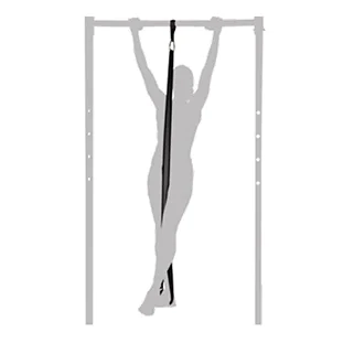 Step 5: Grab onto pull-up bar and position yourself so that the assist system is pulling straight up and down the midline of body, keeping one leg straight with bands underfoot, and the other leg crossed over at the feet.