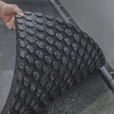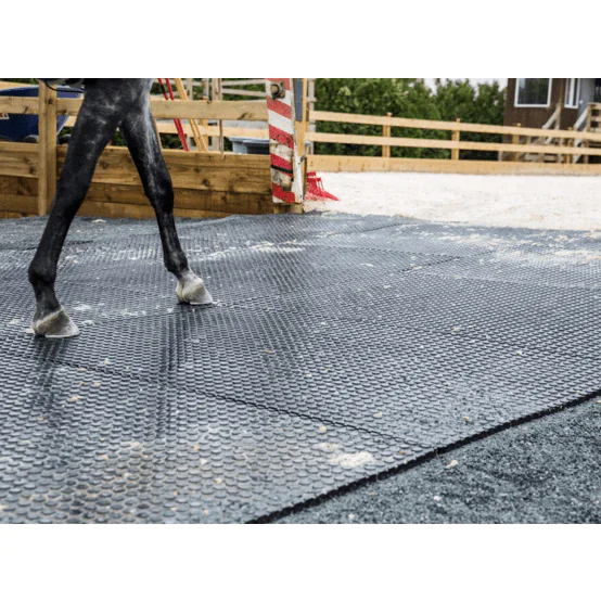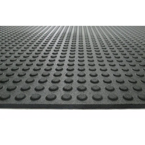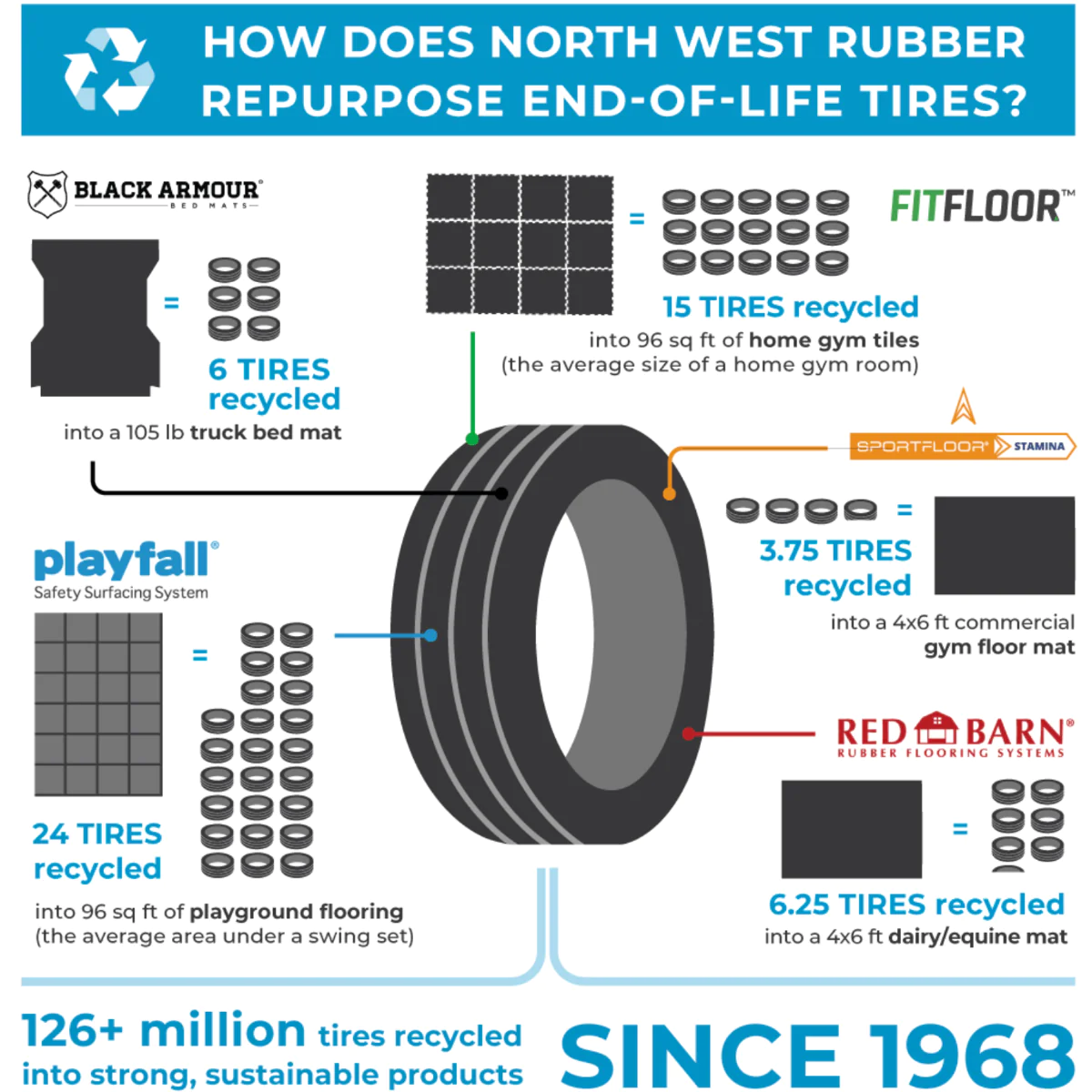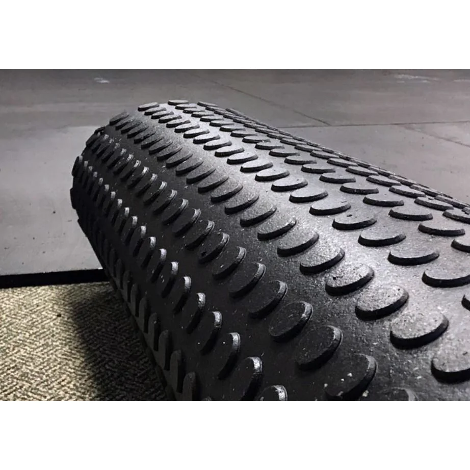 Red Barn Max Rubber Stall Mats For Gyms | North West Rubber (1202220) – Red Barn Stall Mats come in two sizes, 3′ x 4′ and 4′ x 6′, and are made from heavy-duty 3/4″ thick vulcanized rubber. Vulcanized rubber inherently offers an increased tensile and tear strength, similar to that of virgin rubber, making them ideal for locations where heavy impact occurs frequently, such as weight rooms in commercial gyms. Each stall mat features a dual-surface having a classic smooth surface on one side and a raised button surface on the other. The raised buttons provide extra traction, and if positioned face down, they also help enable drainage of liquid underneath while providing increased cushion to the user on the surface. Each mat is 100% recycled vulcanized rubber harvested from post-consumer goods. It takes 6.25 recycled tires to produce a single 4′ x 6′ stall mat. 120 million+ end-of-life tires have been diverted from landfills over the last decade.