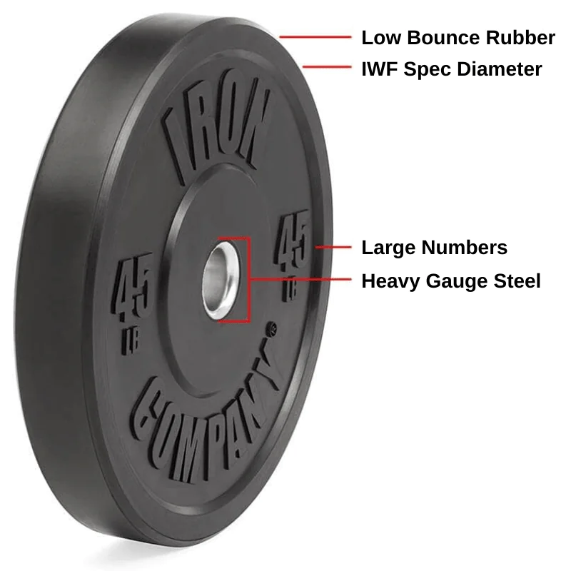 Heavy-Duty Performance – IRON COMPANY rubber bumper plates offer a dead bounce so they stay put when dropped making training in confined areas much safer for the lifter and others around. Our bumpers are very compact, much more so than recycled crumb rubber bumpers, giving the trainee an opportunity to pack more plates on the bar for heavier training in the deadlift and other prime movers. Heavy 55 lb. bumper plates are also available for even more plate packing potential. Large molded numbers are highly visible making plate sizes and weights much easier to identify from longer distances. And IWF specs ensure training consistency and bar compatibility for all your lifts.