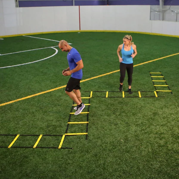 Prism Fitness Group SMART Modular Agility Ladder – The SMART Modular Agility Ladder from Prism Fitness Group is a sports performance tool with step patterns for forward, lateral, and backward movements during athletic field drills to improve agility and speed. The Smart Modular Agility Ladder offers an unlimited variety of agility drills and exercises using the expandable Quick Connect System. Simply snap two or more ladders together end-to-end to create your desired length and connect the rungs together at the sides to create your desired width. Agility ladders can be used on any field or court for all types of sports including football, basketball, soccer, volleyball, lacrosse, and more. In addition, agility ladder training has become an important part of trending crossfit WODs, boxing and MMA training, and portable boot camp regiments. Snap and connect to create various patterns from double and triple lane ladders to obstacles to zig zag, and even a full grid. For coaches, the Smart Modular Agility Ladder simplifies the need to order and stock different types of ladders at your facility (such as longer 30 ladders or double ladders), since universal 15 modular ladders can be combined to make any size configuration needed in length and width.