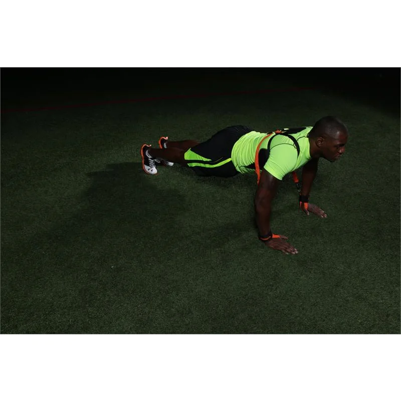 For the first time, athletes have the means to build upper body explosiveness while playing sports or engaging in drills. Comprised of a single Slastix that attaches from the shoulder harness to both hand straps (see photo), athletes have full freedom of movement while practicing resisted chest passes, medicine ball throws, resisted pushups, blocking and virtually any other upper-body sports-specific drill.