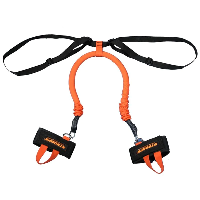 Before putting on the harness, ensure that the Slastix is looped through the back of the harness and attached to each handcuff. Put on each handcuff by placing the thumb through the orange loop and the D-ring on the palm side of the wrist. Wrap Velcro around each wrist so that cuff is snug but comfortable. Put on the shoulder harness by putting each arm through the strap. Adjust the shoulder straps for a snug fit.