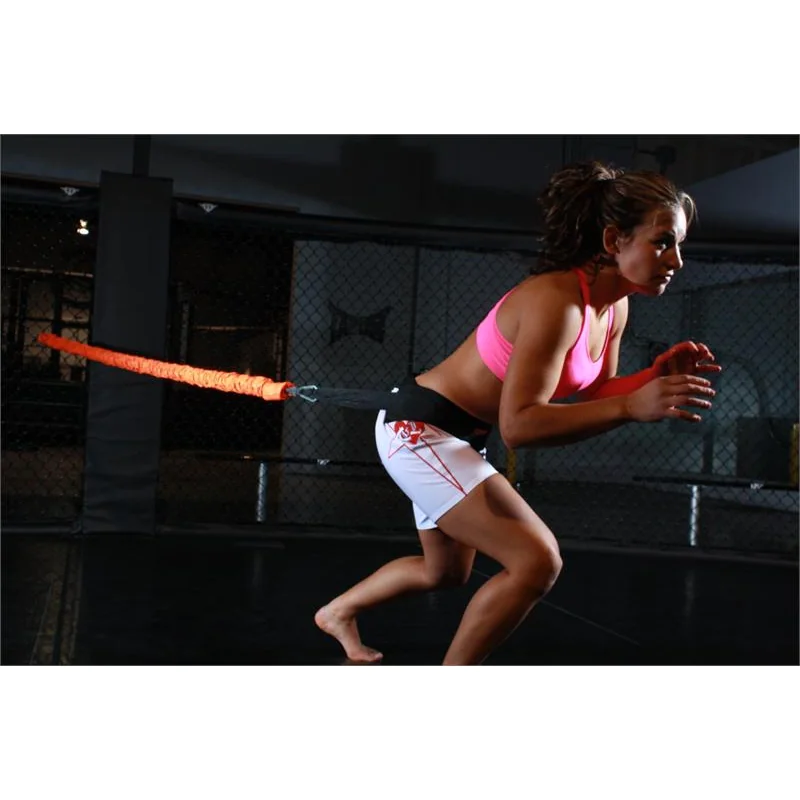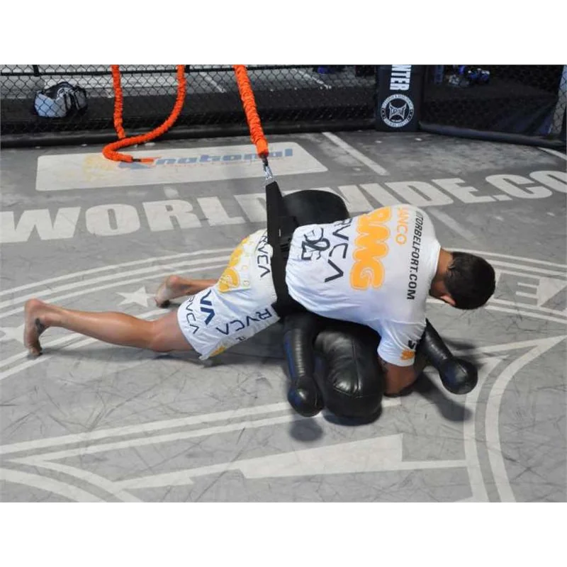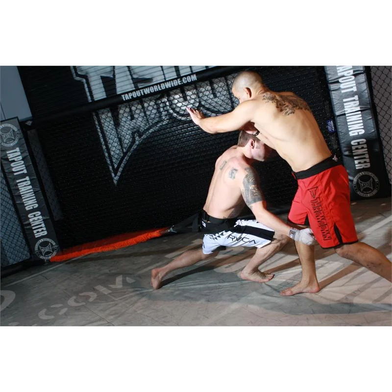 Wearing the padded power-pull belt that attaches the heavy-resistance Slastix to an anchor (such as a wall), fighters can engage in takedowns, bear crawls, ground-and-pounds, and cage-fighting drills. The Takedown belt gives fighters the freedom to turn and rotate the shoulders and hips, while the six-foot Slastix allows them to run twelve feet from any anchored position, giving them a broad arena in which to practice. For grapplers, the Takedown lets you train while lying on your back or from a top position. While using a dummy during ground-and-pound and cage fighting, the Takedown acts as the force from the opponent. (Note: It is recommended to wear a shirt while training).