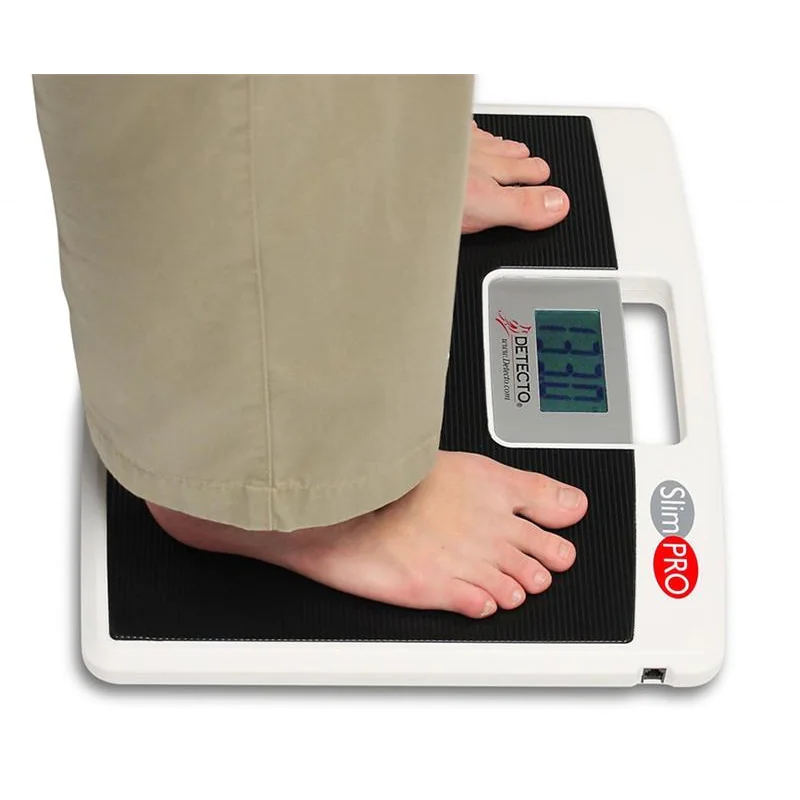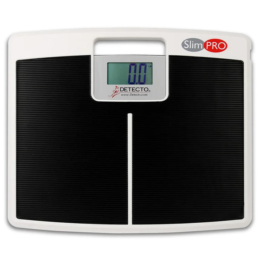 Detecto SlimPRO Low-Profile Digital Healthcare Scale The SlimPRO Low-Profile Floor Scale from Detecto is a high-quality digital healthcare scale designed for performance and durability in clinical grade usage weighing heavy patients. The SlimPROs extra-wide 17 by 14.5 inch weighing platform accommodates patients of all sizes, and the high 440 pound (200 kilogram) capacity allows for bariatric weighing with an accuracy of 0.2 pound (or 100 gram) increments. The incredibly low-profile 1.4 inch slim construction makes stepping on and off for weighing very easy. To help conserve battery life, the doctor scale automatically turns on when a patient steps on the scale, and turns off when one steps off. Weight is conveniently held onscreen for 5 seconds after weighing, easily viewable for patient and doctor alike through big 1.5 inch high LCD digits. Switching units from pounds to kilograms is easily performed through a switch on the back of the physican scale. The digital scales RS232 serial port allows data connectivity via a serial interface cable (sold separately) to an optional thermal tape printer or external PC with EMR/EHR software. The special swivel foot pads allow the platform scale to be used on a variety of floor surfaces, and even allow the SlimPRO to weigh accurately on carpet. Weighing only five pounds and featuring a built-in carrying handle, the SlimPRO battery operated medical scale is designed to be readily portable for easy carry to your patients allowing more privacy and confidentiality during office visit weighings.