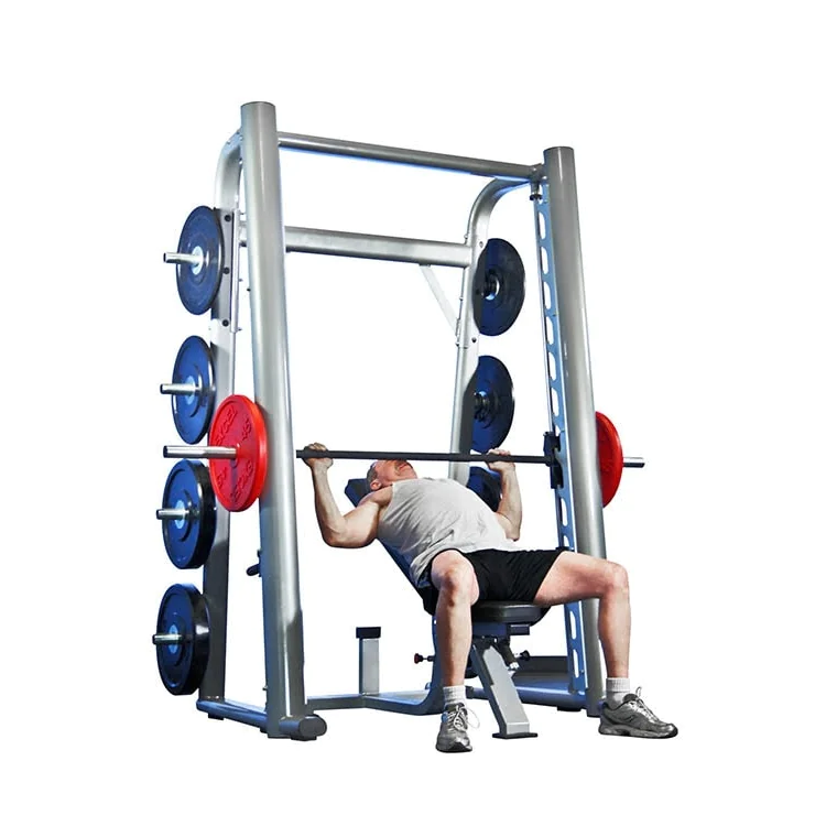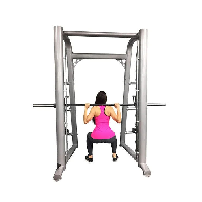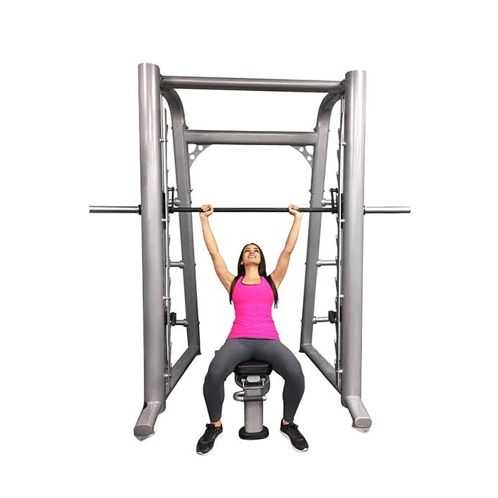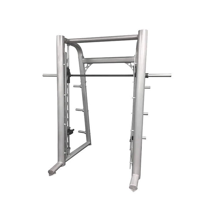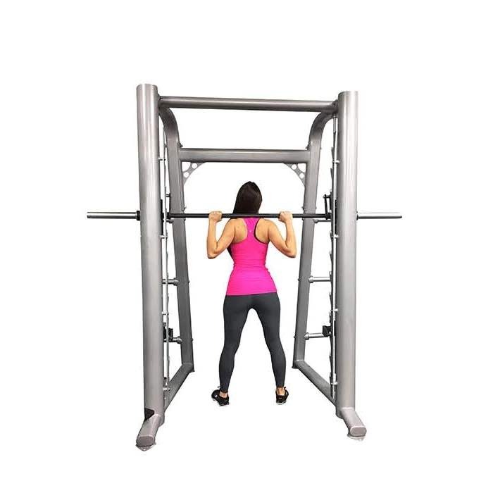 Smith Machine with Linear Bearings – 85″ Tall – Muscle D Fitness (MD-SM85) – The Muscle D MD-SM85 Smith machine with linear bearings is 85” tall making it a better fit for locations with lower ceilings. The hidden counterbalance system renders the Olympic bar almost weightless, which in turn allows for a much lighter starting weight and is ideal for beginners or for rehabilitation exercises. The Olympic bar on the Muscle D Smith machine is equipped with high quality linear bearings that glide over polished chrome guide rods. Laser cut bar holders lock the bar in at the desired height to accommodate users of any size. They also act as a self-spotting mechanism in case of a missed rep on squats or bench press. Adjustable safety stops are also included for additional safety. And three weight pegs on each side keep plenty of Olympic plates within reach for quick weight changes. Purchase an optional Muscle D adjustable weight bench and expand the training versatility of your new Smith machine.
